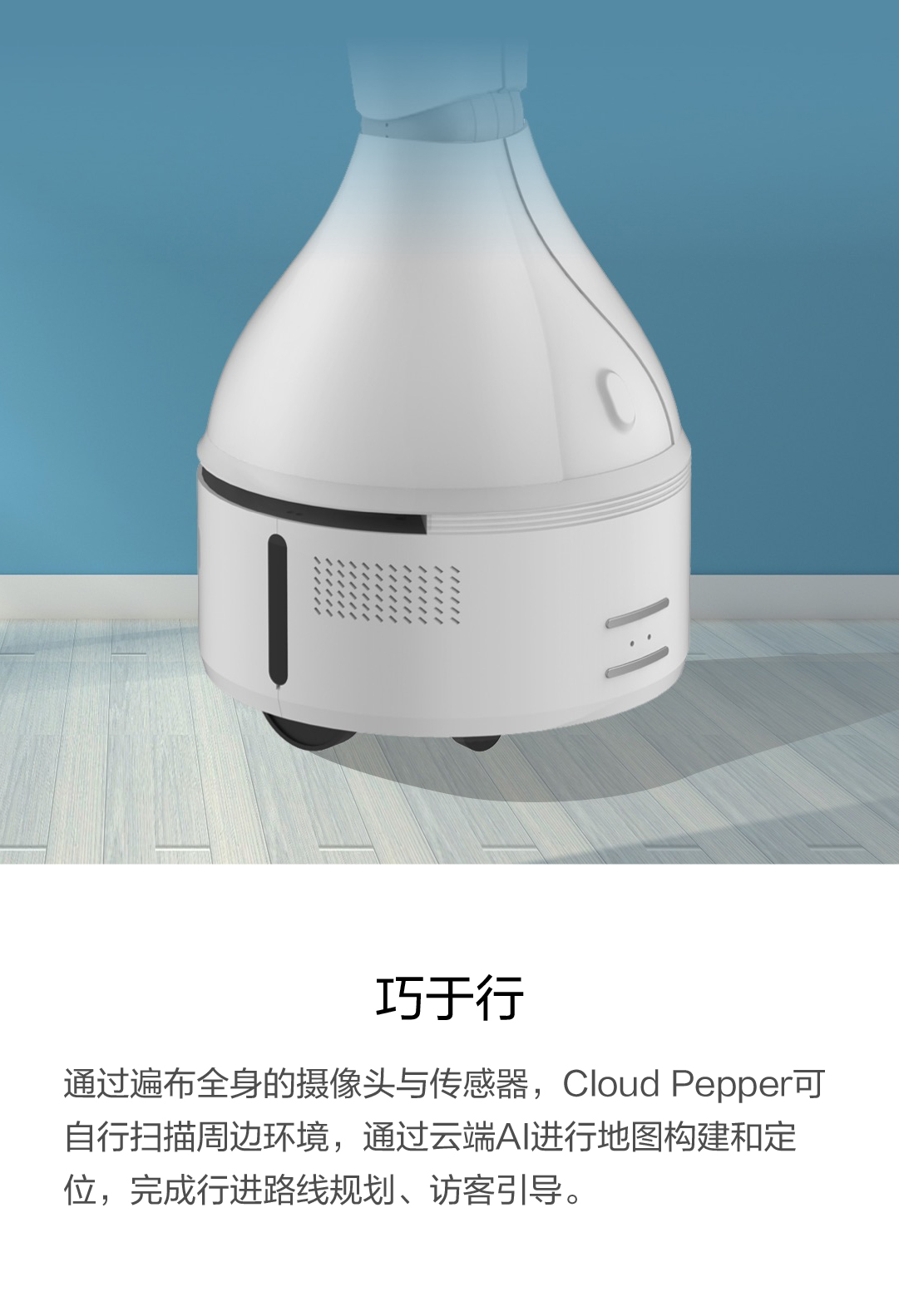 通过遍布全身的摄像头与传感器,Cloud Pepper可自行扫描周边环境,通过云端AI进行地图构建和定位,完成行进路线规划、访客引导。